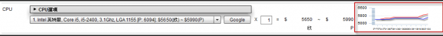 mounhua wrote:真是個不錯的網站!請...(恕刪) Hi mounhua, ya 謝謝建議. 我會將來會把這個功能加進去的!另外今天也更新了報價,這禮拜 JWorks 電腦估價網的最多人選的組合:Intel 組合估價單編號: jpcmqbk3gCPU: Intel 英特爾, Core i5, i5-2400, 3.1Ghz, LGA 1155 [P: 6102] --- (5750 [欣, 紐] ~ 6099 [P]) x1 (5750 ~ 6099)主機板: ASRock 華擎 H61M/U3S3 (B3), Intel LGA 1155, H61, DDR3 --- (2490 [P, 原, 欣, 紐] ~ 2490 [P, 原, 欣, 紐]) x1 (2490 ~ 2490)記憶體: Kingston 金士頓, DDR3 1333, 4 GB --- (690 [紐] ~ 799 [P]) x1 (690 ~ 799)硬碟: WD 威騰, Caviar Blue, WD10EALX, SATA 3, 1 TB, 7200 RPM, 32 MB --- (1850 [原, 欣] ~ 1999 [P]) x1 (1850 ~ 1999)固態硬碟: Crucial 雷克沙, m4, SATA 3, 64 GB, MLC, 415/95 --- (3400 [欣] ~ 3400 [欣]) x1 (3400 ~ 3400)顯示卡: MSI 微星, N560GTX-Ti Twin Frozr II/OC, GDDR5 1 GB [M: 470] [P: 2969] --- (6690 [紐] ~ 6990 [原, 欣]) x1 (6690 ~ 6990)光碟: Lite-On 建興, iHAS524, DVD-RW 24x, SATA (黑) --- (530 [原, 欣] ~ 649 [P]) x1 (530 ~ 649)機殼: Sharkoon 旋剛, 攔截者 PRO, ATX --- (1590 [原, 欣] ~ 1590 [原, 欣]) x1 (1590 ~ 1590)電源: SEED 種子, 80+ Series 500W, 80+ 銅牌 --- (2490 [原, 欣, 紐] ~ 2490 [原, 欣, 紐]) x1 (2490 ~ 2490)螢幕: EIZO, S2402W-FS, 24.0', 1920x1200 --- (17745 [紐] ~ 17745 [紐]) x1 (17745 ~ 17745)總價: $43225 ~ $44251估價單檢視連結 (Html 版本): http://jworks.idv.tw/pc.web/PcMain?code=jpcmqbk3g&type=html估價單檢視連結 (Flash 版本): http://jworks.idv.tw/pc.web/PcMain?code=jpcmqbk3gAMD 組合估價單編號: jpcqb4bt3CPU: AMD 超微, Phenom II X6, 1090T(黑盒), 3.2Ghz, AM3 [P: 6055] --- (5250 [原, 欣] ~ 5710 [P]) x1 (5250 ~ 5710)主機板: Asus 華碩 M4A88TD-M EVO/USB3, AMD AM3, 880G/SB850, DDR3 --- (2450 [欣] ~ 2490 [原]) x1 (2450 ~ 2490)記憶體: Kingston 金士頓, DDR3 1333, 4 GB --- (690 [紐] ~ 799 [P]) x1 (690 ~ 799)硬碟: WD 威騰, Caviar Blue, WD10EALX, SATA 3, 1 TB, 7200 RPM, 32 MB --- (1850 [原, 欣] ~ 1999 [P]) x1 (1850 ~ 1999)固態硬碟: Crucial 雷克沙, m4, SATA 3, 64 GB, MLC, 415/95 --- (3400 [欣] ~ 3400 [欣]) x1 (3400 ~ 3400)顯示卡: MSI 微星, N560GTX-Ti Twin Frozr II/OC, GDDR5 1 GB [M: 470] [P: 2969] --- (6690 [紐] ~ 6990 [原, 欣]) x1 (6690 ~ 6990)光碟: Lite-On 建興, iHAS524, DVD-RW 24x, SATA (黑) --- (530 [原, 欣] ~ 649 [P]) x1 (530 ~ 649)機殼: Sharkoon 旋剛, 攔截者 PRO, ATX --- (1590 [原, 欣] ~ 1590 [原, 欣]) x1 (1590 ~ 1590)電源: SEED 種子, 80+ Series 500W, 80+ 銅牌 --- (2490 [原, 欣, 紐] ~ 2490 [原, 欣, 紐]) x1 (2490 ~ 2490)螢幕: EIZO, S2402W-FS, 24.0', 1920x1200 --- (17745 [紐] ~ 17745 [紐]) x1 (17745 ~ 17745)總價: $42685 ~ $43862估價單檢視連結 (Html 版本): http://jworks.idv.tw/pc.web/PcMain?code=jpcqb4bt3&type=html估價單檢視連結 (Flash 版本): http://jworks.idv.tw/pc.web/PcMain?code=jpcqb4bt3