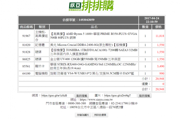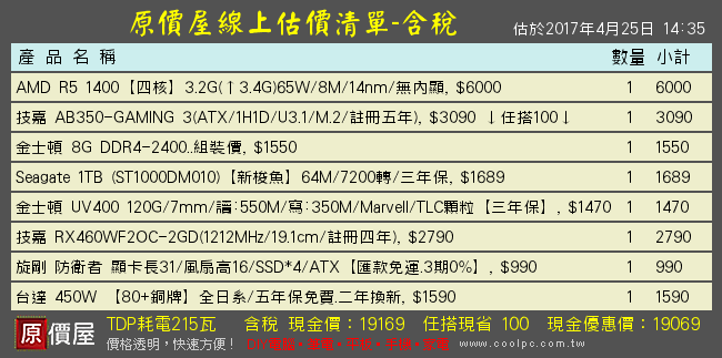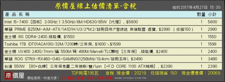 需求是在玩遊戲的話 顯卡建議 至少 RX 470,固態硬碟非必要TOSHIBA 1TB(DT01ACA100) /7200轉/SATA3/32MB/這顆加500元變成2T,32MB>>64MB顯卡可以挑原價屋下面的單子,組合起來約2萬元左右