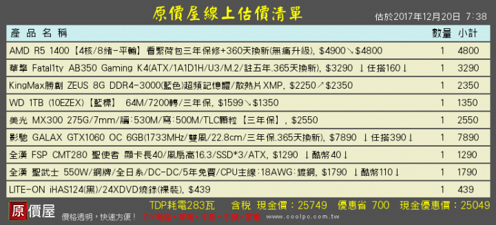 EJY80079 wrote:自己拉選單子,擔心...(恕刪) 25k 不含 os, r5 1400, 8g, 1060板子一樣選五年保, SSD 拿 240g 以上的, 1060 上 6g 版本cpu 可以考慮小爆一些上 r5 1600