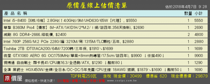 劉俊良 wrote:有職人可推3萬元電...(恕刪) 30k 不含 os, i5-8400, 16g, 1060 6gSSD 上 760p, 硬碟拿 2t, 機殼看個人喜好多開 + 單機可以改拿 r5 1600, 之後再補 SSD不急著組的話等一下月底 ryzen 2000 series