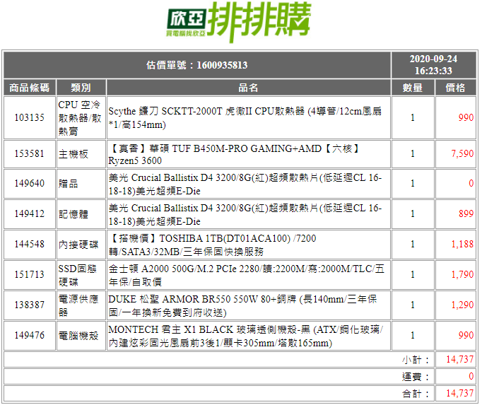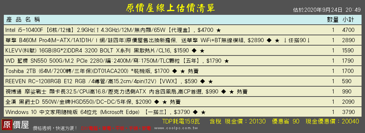 Ryanstar0120 wrote:由於對電腦零件不太熟(恕刪) 20k 含 os, r5 3600, 16g, 顯卡沿用cpu 拿 r5, 512g nvme SSD + 2t 硬碟, 機殼拿組合送散熱器20k 含 os, i5-10400f, 16g, 顯卡沿用偏好 intel 的話改拿 10400f