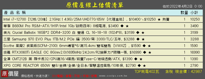 lio75853@gmail.com wrote:天堂m菜單想問天堂m(恕刪) 拿 5800x 不如拿 12700, 散熱用空冷就夠了8c16t 那個記憶體應該用不完你如果想用套組的話, amd 要也是直接拚 5950x47k 小爆不含 os, i7-12700, 64g, 3060tiSSD 上 p5 plus 1t, 散熱用空冷雙塔, 機殼看個人喜好43k 不含 os, i7-12700, 32g, 3060ti49k 不含 os, r9 5950x, 32g, 3060ti