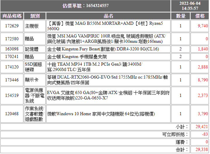 liucc42 wrote:想組一台電腦3萬元以(恕刪) SSD 如果你預算只夠買 500g 級距又想要 gen4, 改 980 pro不然我是覺得你多的預算不如顯卡上 306026k 不含 os, i5-12400f, 16g, 3050改拿 12400f, SSD 上 980 pro, 多拿散熱器, 機殼看個人喜好27k 小爆不含 os, i5-12400f, 16g, 3060SSD 改 gen3, 卡上 306027k 不含 os, i5-12400f, 16g, 3060改這樣就 27k 預算內19k 不含 os, r7 4750g, 16g, 內顯18k 小爆不含 os, r7 5700g, 16g, 內顯如果你遊戲需求不大的話, 要省錢也是可以拿 apu