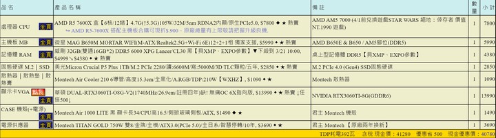 seacbb wrote:請建議目前配備,是否...(恕刪) SSD 都要買 gen4 了, 沒特別便宜沒理由買 dramless 的螢幕要 2k 高刷差不多錢拿 xv272u v 好點, 單純便宜的話可以考慮 275m8rz45k 含 os 螢幕, i5-13500, 32g, 3060ti沒要超的話改拿 13500, SSD 上 kc3000機殼看個人喜好, os 拿彩盒版45k 含 os 螢幕, i5-13500, 32g, 6750xt不排斥 A 卡也可以拿 6750xt45k 含 os 螢幕, i5-13500, 32g, 6750xt需要 wifi 的話改這樣