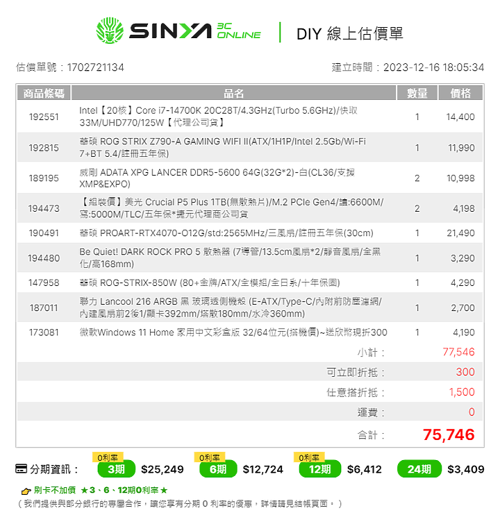 PINNN wrote:想詢問各位有無推薦組機的菜單 7950X +4080 +技嘉17相8層主板 +威剛64G低延遲記憶體的菜單散熱用空冷王MA824殼拿聯立216,僑威代工ATX3.0十年保三年快換!