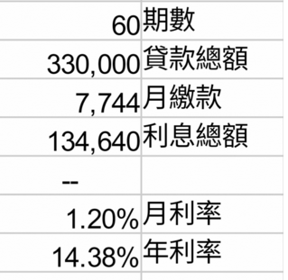 樓主的中古車貸款 33 萬,月繳款 7744 元,合理的還款期數應該在 48 期頂多 50 期,48 期的話,年利率約 5.96%,50 期約 7.75% 這算高利貸了....