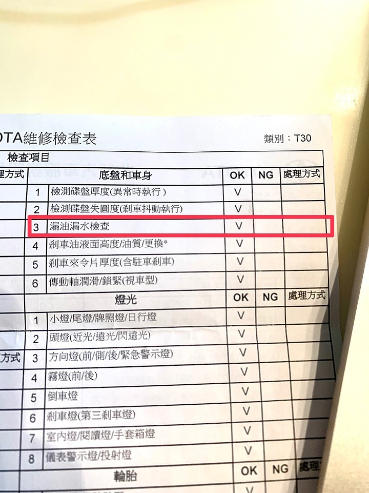 下圖為維修檢查表,漏油漏水檢查竟然OK