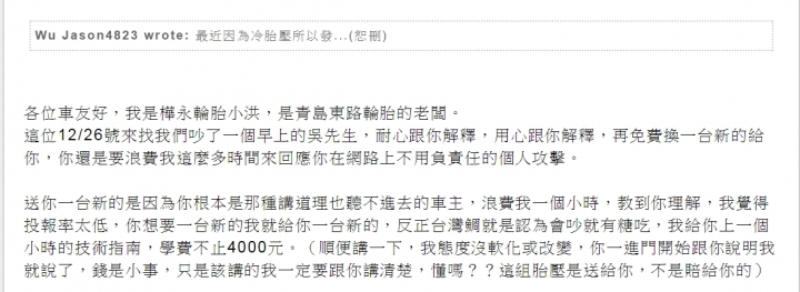 總結:好好思考為何這有爭議的問題車主敢去申訴與質疑?!難道事前車主維修前沒先自行處理這問題與請教過其他專業人員?!維修前與店家的認知亦只是更換胎嘴而已!