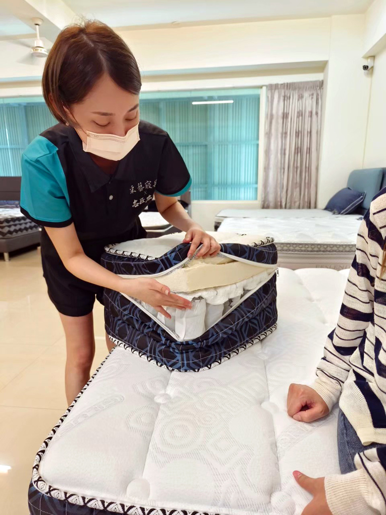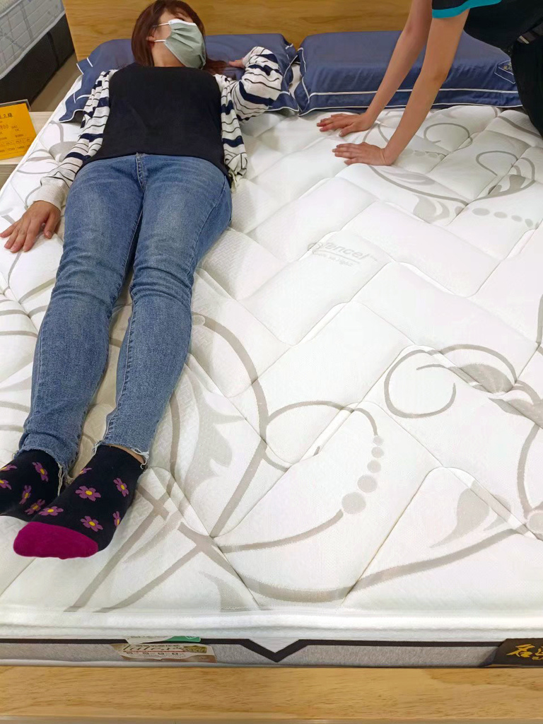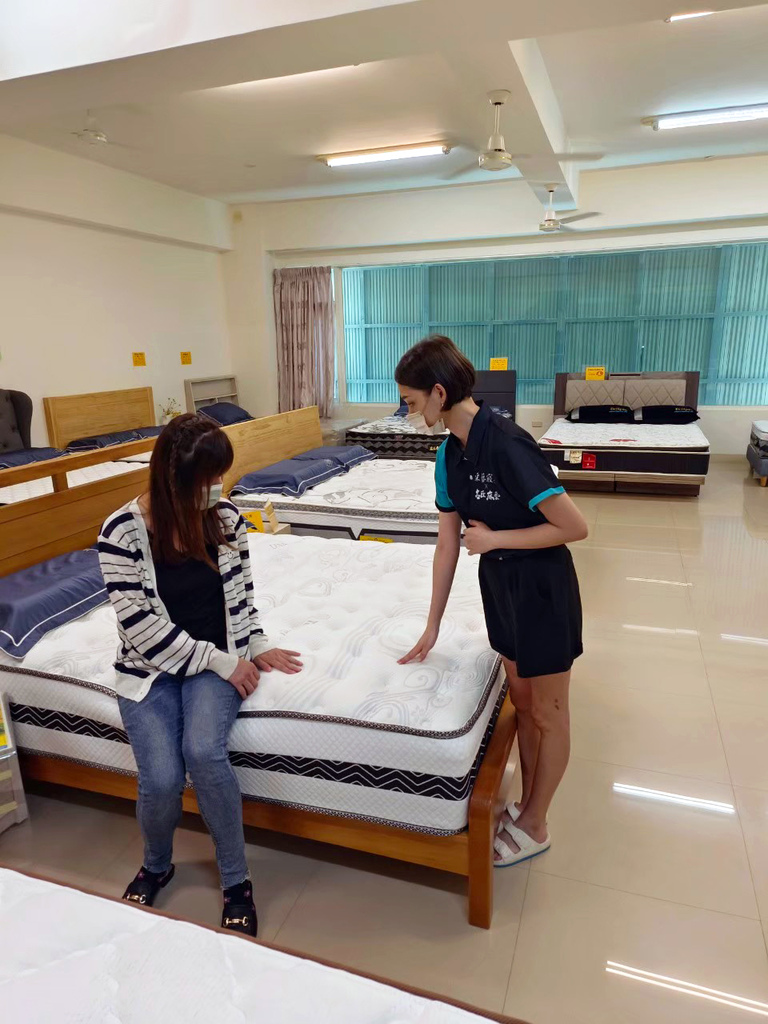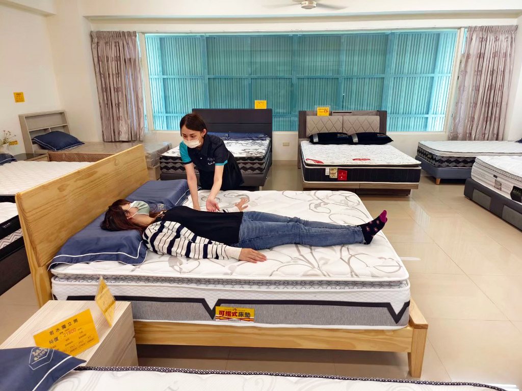 店員帶我們到2樓床墊展示間,試躺幾張支撐力高、透氣好的獨立筒床墊
