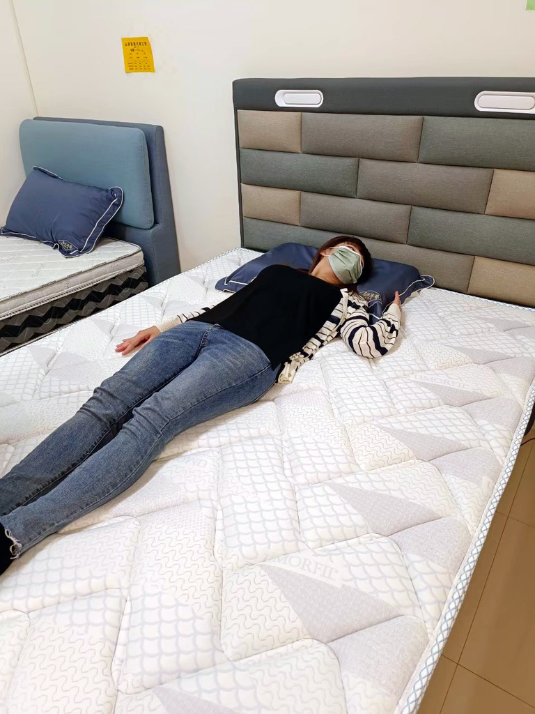 我們小時候都睡硬板床,所以我妹習慣更硬挺的床墊,店員又帶我們繼續試躺