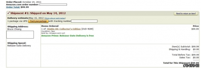 星期天早上就出貨, 今天 5/14 早上7點多, 郵差就把這 Diablo 3 典藏版交到我手上.