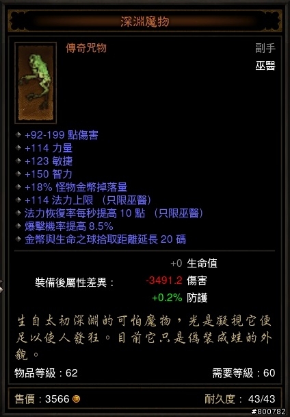 GF疊滿98% 第一次跑ACT3就打到這兩個之前在ACT1打幾十個小時都打不出個屎= =我用巫醫 所以自用 超爽的啊!!!!巫醫的痛苦誰人知~~~ 打老半天都看不到專武和副手終於來一個讚的了剛上美服AH看 加爆率和GF好像滿稀有的 而且護甲值很不錯如果敏再骰到高的那一端 這帽子就頂天了啊!!!