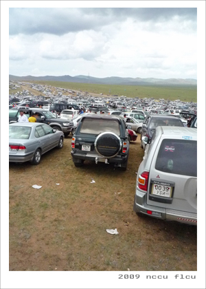 一路搖搖晃晃終於到了比賽場地,來到的時候整個嚇了一跳。雖然知道比賽場地是一片大草原,但草原上滿滿的車子很驚人,朋友說這是世界上最大的停車場。因為完全沒有規劃,停放車子的方向也很隨意。