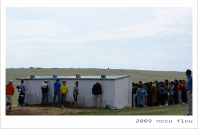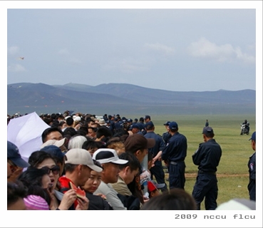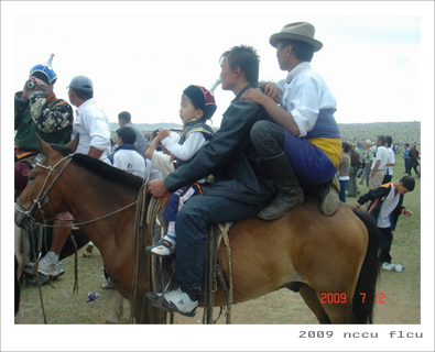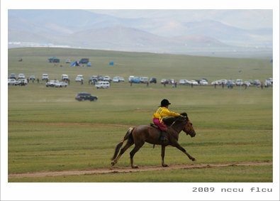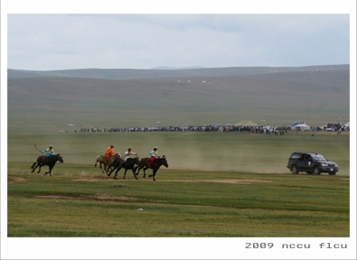 雖然是第一次看賽馬,也看的不是很清楚(不要被照片給騙了,這是用長鏡頭的單眼拍出來的,實際上距離其實有點遠)。但當幾個選手正在激烈追趕彼此,遠遠地看著他們抽打馬匹,然後終於有人勝出的那種感覺還是很棒的(而且選手感覺上都是很小的小朋友們耶)。可以理解為什麼蒙古人會這麼喜歡這項比賽。