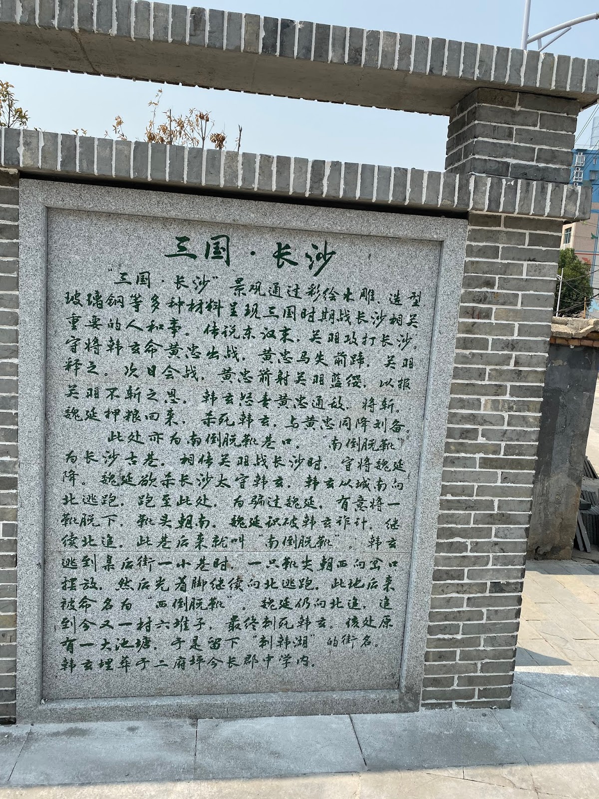 民間傳說,三國時,關公戰長沙就曾留下很多美好的街名。比如關公從天心閣攻入長沙城,經過「一步兩搭橋」,在休息時產生了「吊馬莊」,韓玄的部將魏延追殺當時長沙太守韓玄時,左拐右拐出現了「磨盤灣」,追殺中被韓玄迷惑成「南倒脫鞋」、「西倒脫鞋」,最後刺殺韓玄留下了“刺韓湖”(賜閒湖)。關公北上出城又留下一連串的地名,如「落刀嘴」、「撈刀河」等。