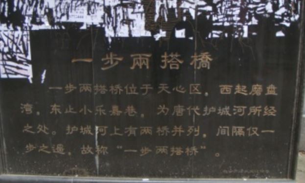 「一步兩搭橋」也是唐代護城河經過之處,護城河上有兩座並列的橋,間隔距離僅一步之遙,所以叫「一步兩搭橋」。 「一步兩搭橋」在“文革”時竟有立場不穩之嫌,故一度更名為「反資街」。這些街巷大多數曲折迂迴,以前兩廂間都是一些幽深古樸的老宅。