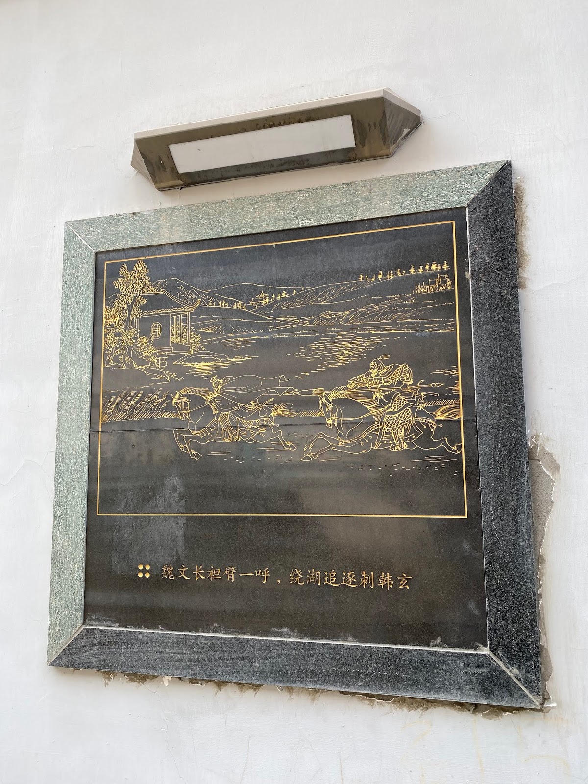 之前說到「南倒脫靴」,魏延識破韓玄詐計,繼續向北追韓玄去。韓玄逃到今解放西路一小巷岔口時,又將另一隻靴朝西向岔口放著,自己朝北奔去。此巷後來就叫「西倒脫靴」。魏延仍向北追,追到今又一村六堆子那裡,最終刺死了韓玄。