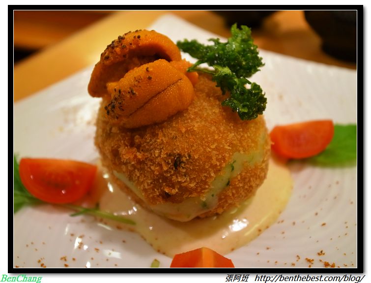 因位女王大人真的很愛吃可樂餅,所以點了這道。但是令人驚訝的是,不只是單單純純的一顆可樂餅,還在外面搭上了其他水果與醬來作到視覺上的調配,真的是很用心。這裡不得不談談最外面那兩片稍微用火烤過的海膽,這是張阿班第一次吃這樣料理的海膽,真的是很特別的口感,一些些的酥酥脆脆,確是讓裡面軟嫩的感覺,更有層次感,而且加上一點點的芝麻,吃起來更是提升了本身味道的鮮度,實在不可多得。至於內餡部份就更令人興奮了,跟焗烤一樣,一點都不小氣的用量,而且因為鮮度夠,讓整個可樂餅吃起來不會膩,真是太好吃了。