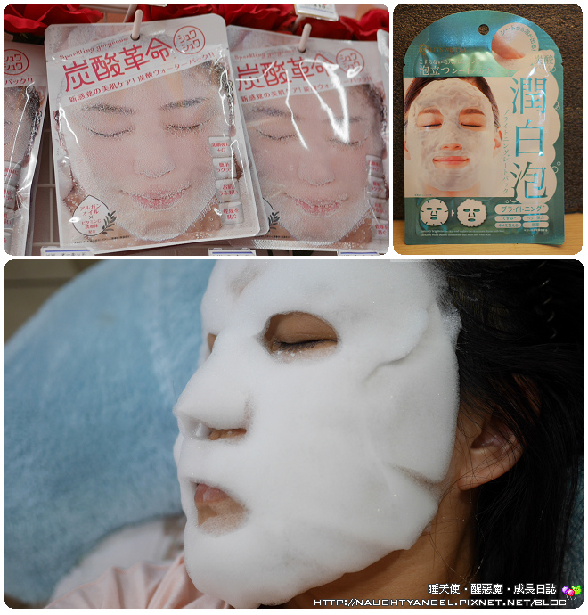 潤白泡面膜我就沒那麼笨了,還好打開來是很正常的一片面膜,往臉上放後,兒子嚇到的問為什麼我的面膜起泡泡,一照鏡子發現真的是柔柔的泡泡,而且不會掉耶~敷的時候感覺有汽水在臉上咚咚作響,敷完後把臉沖乾淨,整個臉好舒爽。