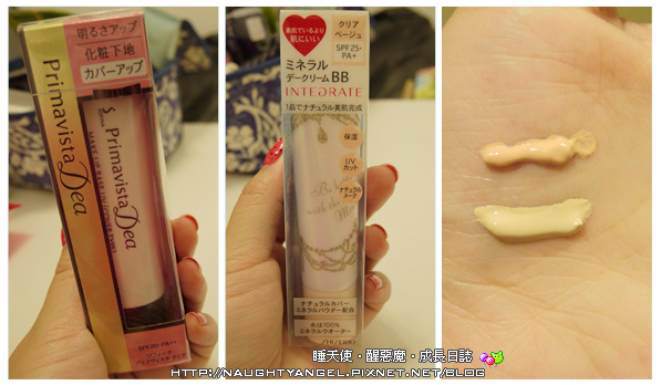 SOFINA「Primavista」零瑕疵妝前修飾乳 和 INTEGRATE 毛孔隱形礦物修飾霜,這兩款在台灣都買的到囉,光看包裝就知道目標群不一樣,SOFINA偏向輕熟女,而 INTEGRATE的夢幻包裝,向來深受女孩兒的喜愛,我是覺得這兩款的功能都差不多,都有防曬、平衡黯沈黃皮膚、遮毛孔斑點、保濕,但INTEGRATE的顏色偏白,且有添加礦物可吸附油光似BB霜,兩個質地都很好推勻,遮瑕力也都不錯,但INTEGRATE抹起來會比原本的皮膚亮白,SOFINA的就較偏自然色,不知道是不是年齡又增長些,SOFINA的比較深得我心,呀~~果然已經不是少女了XD