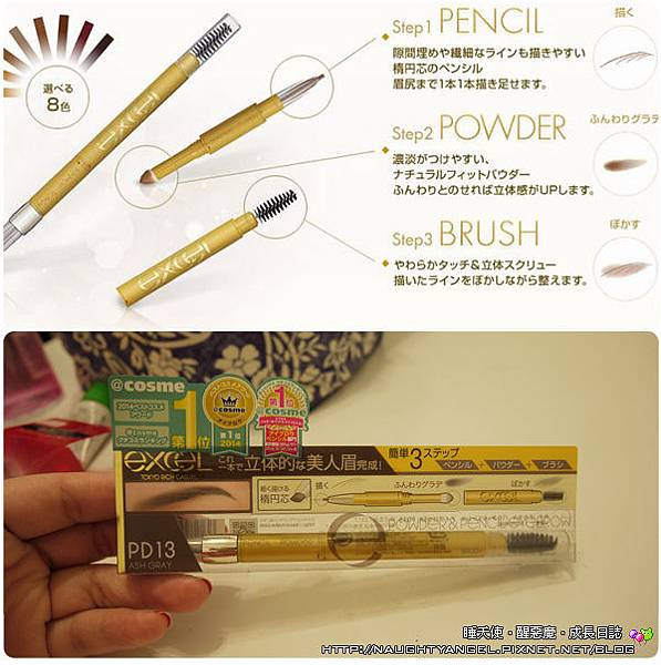 相見恨晚的excel 3合1眉筆,真的好好畫,很喜歡筆蕊的設計,畫起來相當順手,共有8色,難怪2014得美妝大賞,因為光這一支,三種型式的工具,可快速畫出立體又自然的眉型喔,非常適合隨身化妝包中,不佔空間又輕。