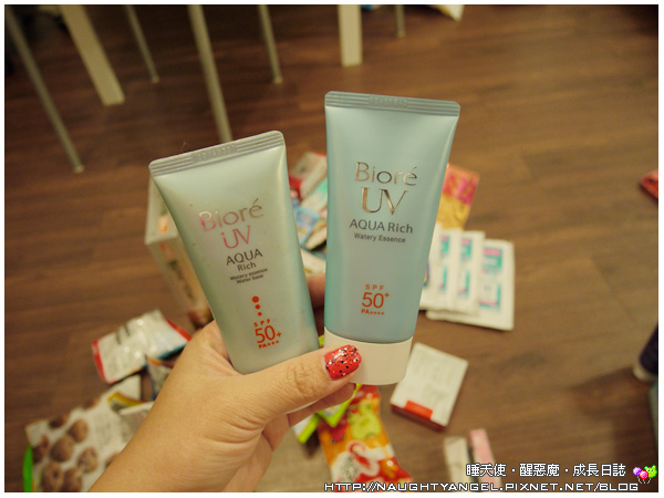Biore 這款 AQUA RICH 防曬品是某年下墾丁時,到小屈誤打誤撞買到,水感防曬精華液一試之後就愛用到現在,右邊是今年在大阪買的(新包裝),高防曬系數,清爽不厚重,保濕度高,而且有淡淡的柑橘香,很適合夏天使用,大推~