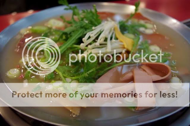 我們吃到的部隊鍋裡面有很多的腸類,長的很小巧的年糕,金針菇,菜,餃子,麵,