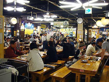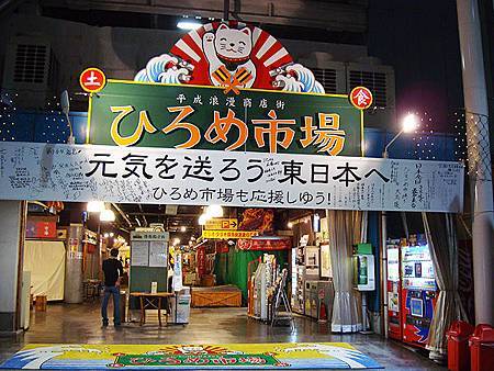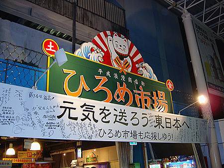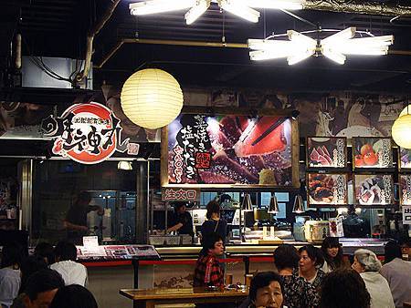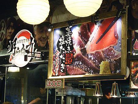 在找鞋店的同時、意外找到了ひろめ市場,這原本是在第2天晚上才會去的地方、去完鞋店後我們便在這吃到很有特色的晚餐。要吃到高知的鰹魚或鯨魚風味美食、可以來到ひろめ市場,這地方有點像是百貨公司的美食街、有居酒屋、料理餐廳、名產店、點完餐後就自己找位置、晚餐就在ひろめ市場中著名的鰹魚料理「明神丸」享用。
