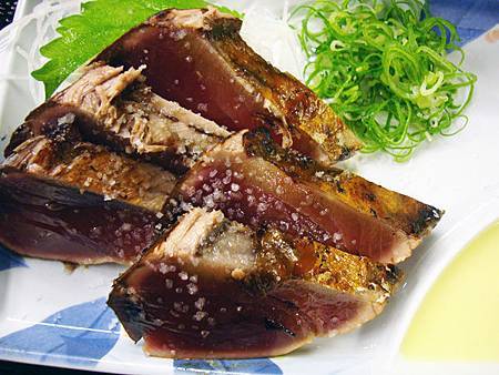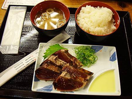 我們點了土佐著名料理「たたき定食」,它是先用「稻草」點火、燒烤鰹魚的魚皮後、加上蔥花、撒上粗鹽、沾上特製醋料、一份半生半熟的鰹魚定食就完成了。當咬下的同時會有稻草的焦香在你嘴中圍繞、焦香加上粗鹽與醋料的結合、這種口感真的是美味極了。我與朋友都讚不絕口!吃完後便帶著飽足感回飯店休息,準備第2天重點行程!