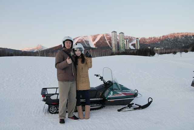 安全第一!邱仔跟關小姐沒有選擇挫冰香蕉船,最後選的是8公里雪上摩托車之行, (5公里=3150日圓,約1200台幣 ;8公里=4200日圓,約1620台幣 ;10公里=5250日圓,約2020台幣),千萬不要選10km,因為真的很冷,雖然只有負5度,但是風吹起來真的還滿冷的