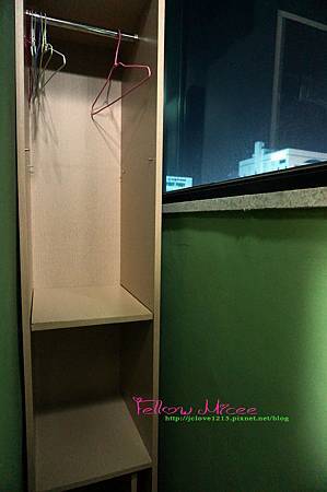 玻璃門打開是小型的衣櫥還有垃圾桶,窗外還可以直接看到現代百貨唷!!!