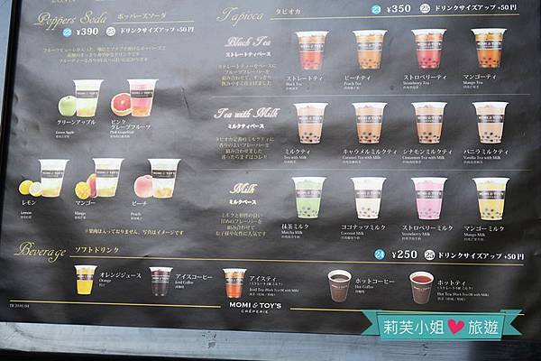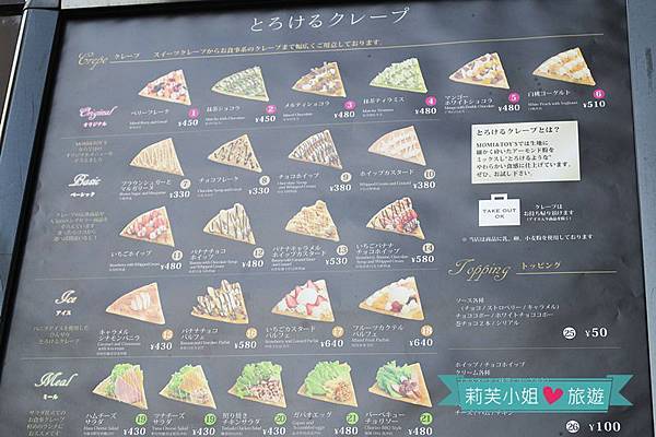 邊排隊邊物色好要吃什麼,除了各種口味的可麗餅以外,也有提供珍珠類的手搖飲料,圖片提供日文、英文跟中文產品名稱。