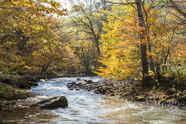 | 兩旁樹木將金光注入溪流,詩情畫意 |