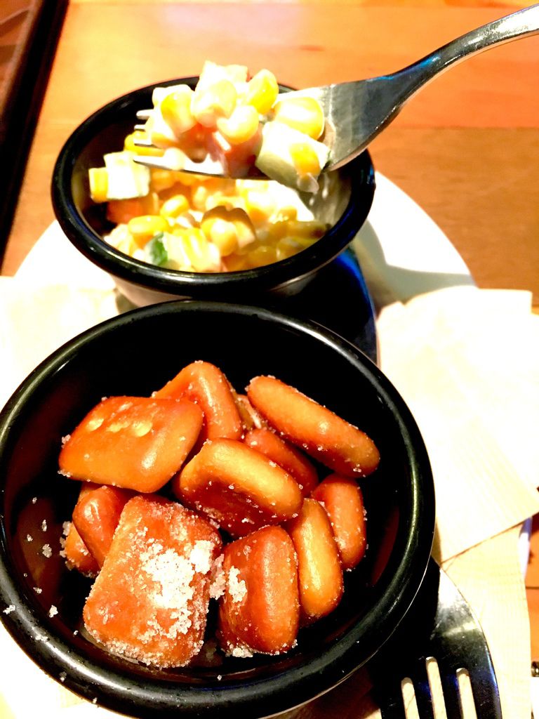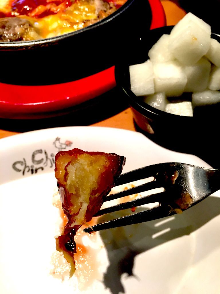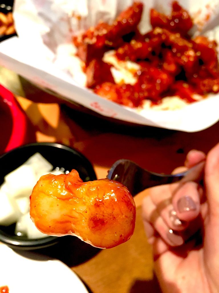 雖然裹著醬汁,炸雞表現還是紮實堅硬的,口感還在。 炸雞之間還有炸年糕,外表脆硬、裡面還是軟的。 不知道是不是他圓圓的、Q彈口感很對我的味。