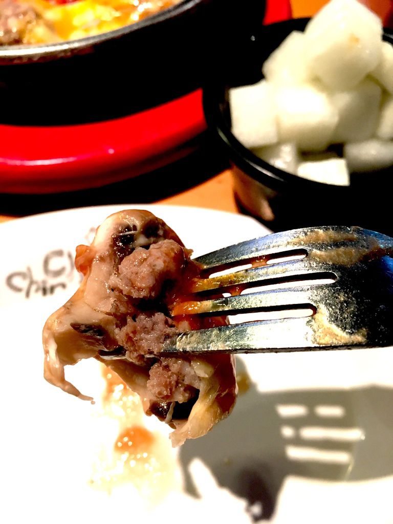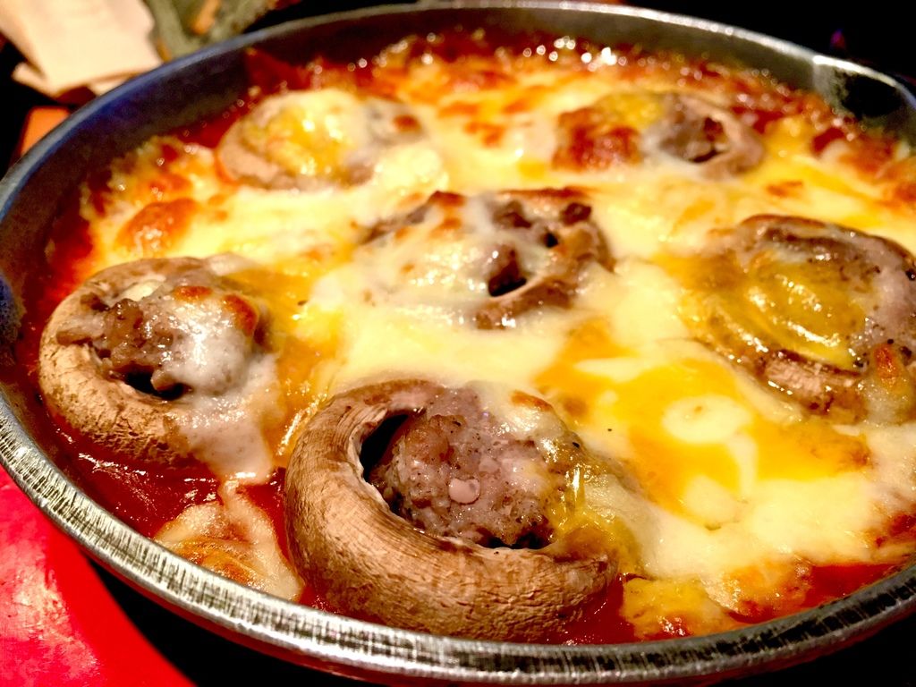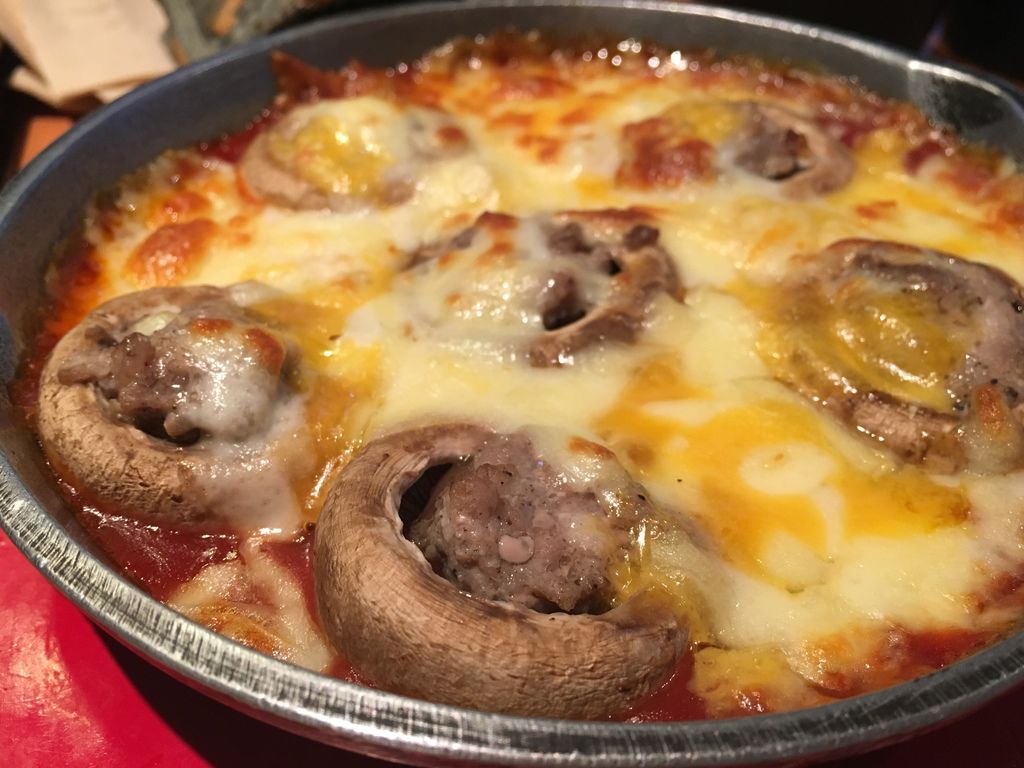 沒注意到有附小菜,我們另外點了奶酪蘑菇,基本上就是磨菇加番茄醬去焗烤,蘑菇很厚,裡面塞了絞肉,厚實又多汁。