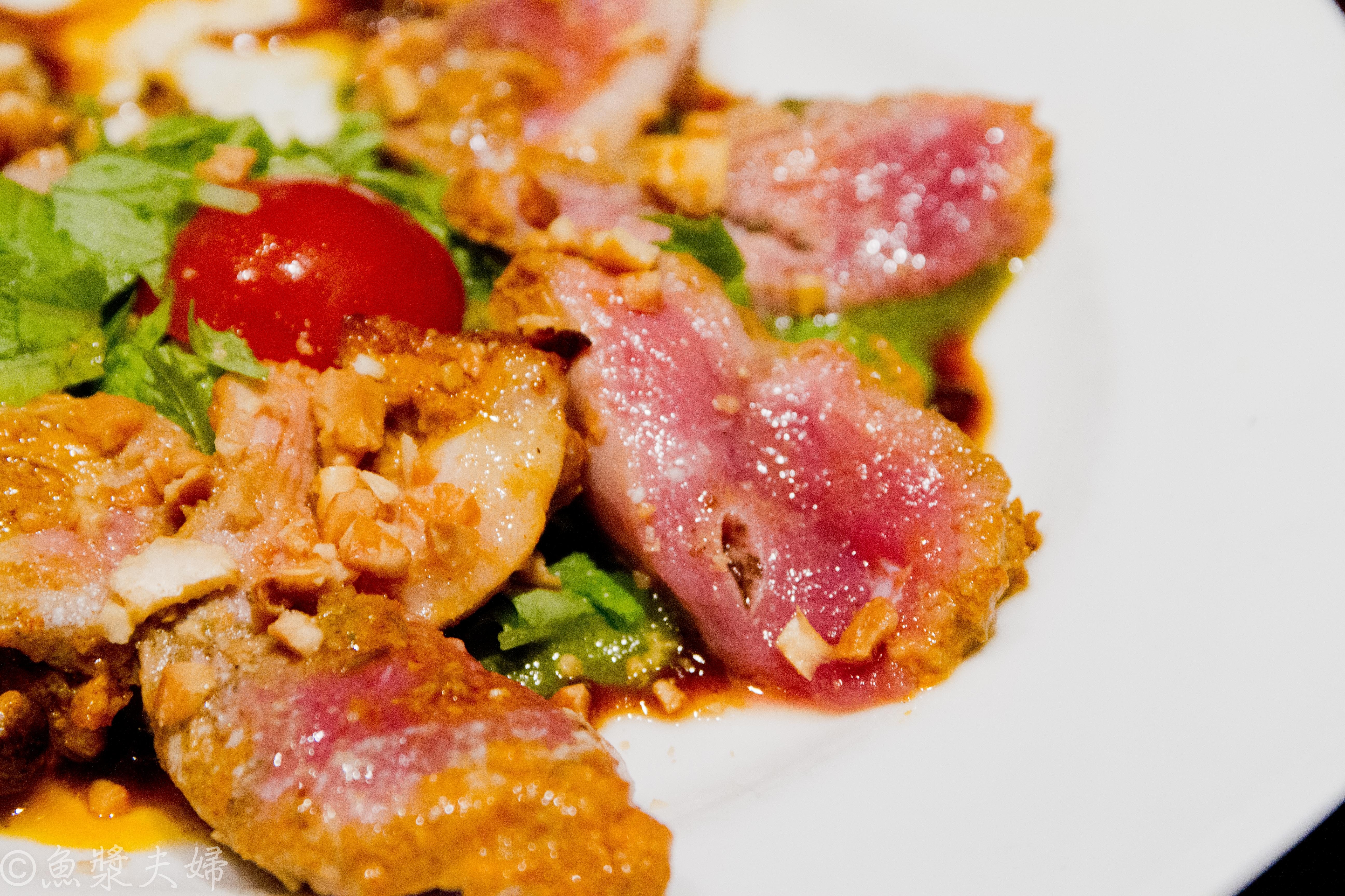 坦嘟里風味在外的三分熟鴨肉,外面微微烤過,薑蒜香氣濃郁而不過冲,優格帶來的淡淡酸氣讓整體柔和許多。鴨肉脂肪感不重,肉質細膩多汁。在酸味的堆砌上用上了紅酒醋,加上花生碎粒。要說是印度料理也名符其實,但若弄小份一點說是道法國料理,我看也贊同者也大有人在。