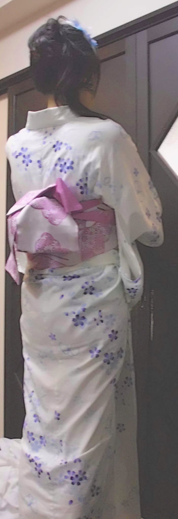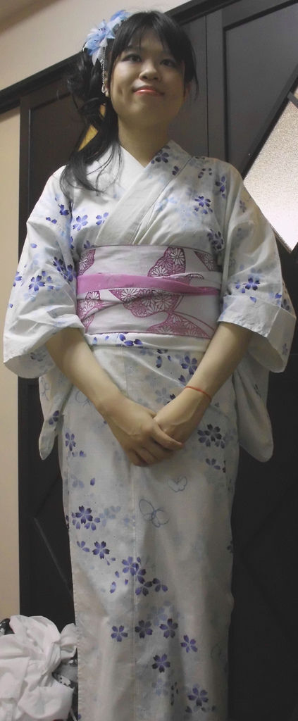 由於只能選擇三千多日圓的租賃浴衣,本來是想挑有沒有牽牛花圖樣的浴衣,有在考慮櫻花、黑色系浴衣,後來想想看到這麼多人穿紅色或黑色,不合夏季,夏季正午最適宜淺色浴衣,之前也是被老闆娘否決「要穿櫻花的,就不要挑這條紫色蝴蝶花樣的腰帶」,我堅持我一定要穿這條腰帶,又去重找適合腰帶的浴衣,嘿~好險~