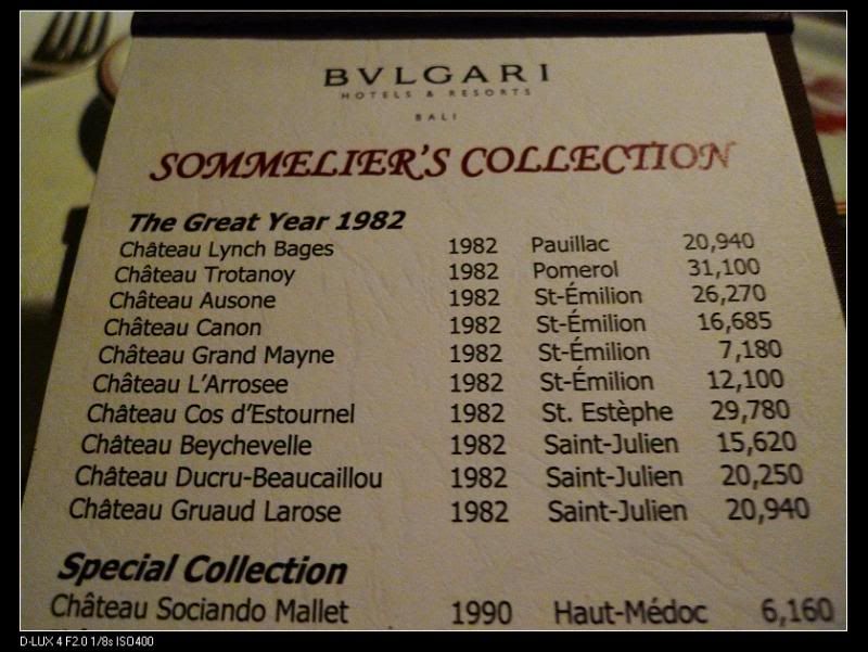 想不到這裏82年的收藏也是挺豐富的哦,不過價錢也被炒得滿高的,就拿AUSONE來說,幾年前我在香港喝的時候才港幣不到8千,現在這裏換算要馬幣9千多,真的是。。。:L ,不過82年的,喝一瓶少一瓶,值不值得就看各位了~