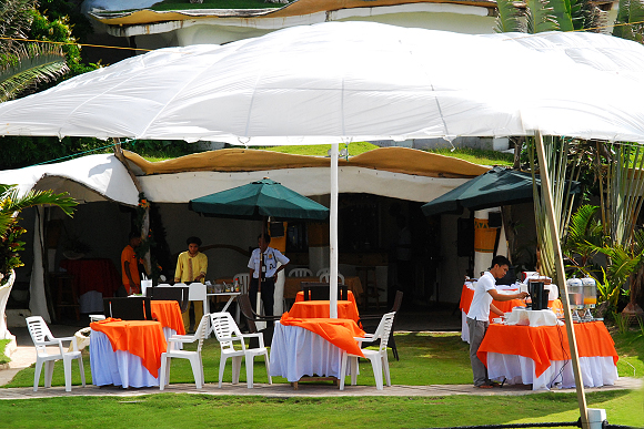 隔天早上,那一間間可愛的茅草發呆亭就是房客們享用早餐的地方。可惜我們去的不是時候,好位置都被捷足先登了,所以只能在簡易搭蓋的遮陽布下用餐,還是一樣熱到不行,完全抵擋不了長灘毒辣的太陽!不知道從什麼時候開始,早餐改為自助式,先前爬文是有美式、菲式等套餐可選擇,照片看起來十分誘人可口,但是變成自助式後,覺得菜色沒幾樣好吃的,讓人有些失望~還好眾人激推的鬆餅嚐起來果真不同凡響,有服務人員在一旁現點現做,想吃多少隨你點,讚啦