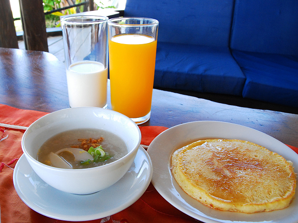 除了必點的鬆餅之外,我覺得鹹粥也不錯,比起那些西式吐司和乾巴巴的培根好吃多了!
