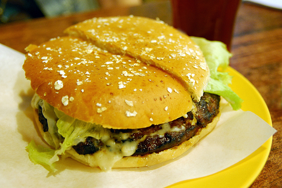 我們等一下還要去吃Shakey's,在這裡不打算吃太多,所以沒點那和臉一樣大的TRIPLE X超級飽(堡),而是點了其他有人推薦的THE BOMB炸彈堡。內夾1/2磅重百分百純牛肉,選擇的配料是烤大蒜和奶油起司,一咬下去驚為天人哪~~碳烤過的牛肉好香好好吃,搭配奶油起司是一絕(記得沒什麼大蒜味),而漢堡的麵包也不馬虎有先烤過,美味到讓我想要灑花+轉圈圈呢