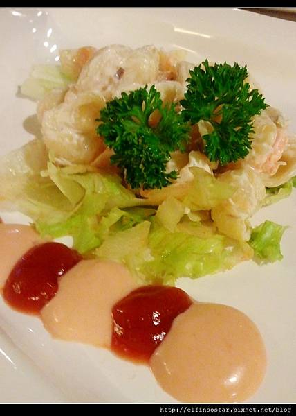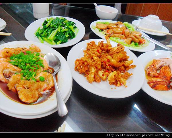 有蝦子、炸章魚、雞肉(有點鹹)、炒青菜、偽干貝豆腐