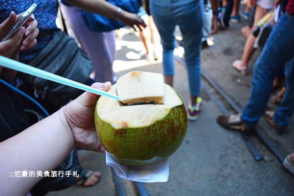 ▲走了一下回到車站附近等火車來,這邊有在賣冰涼的椰子水