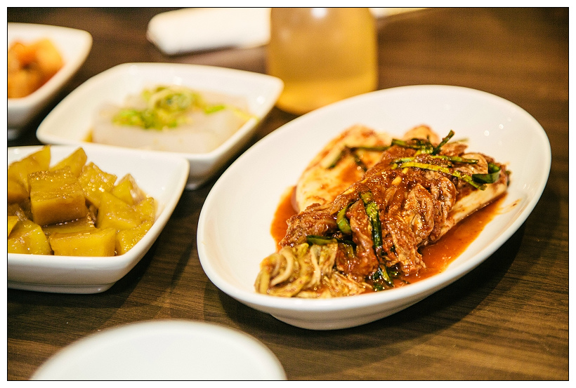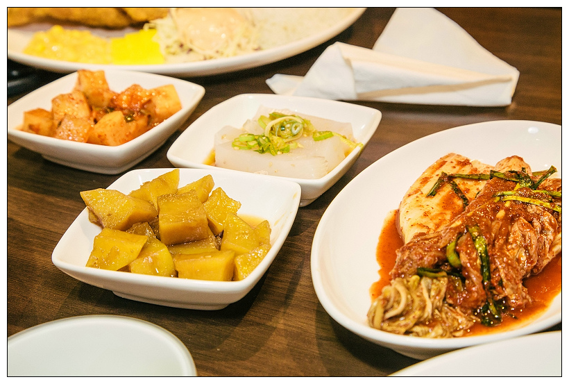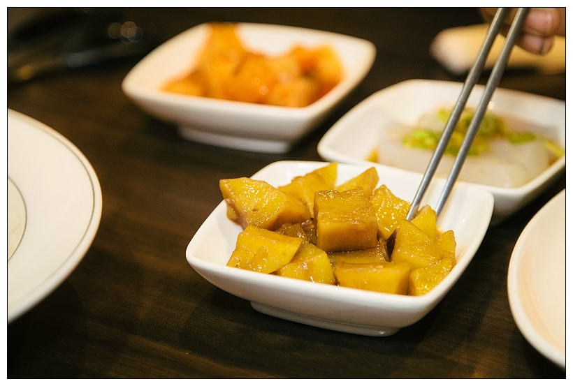 如同其他韓式料理,風爐也有提供韓式小菜。這裡的小菜是目前栗與維尼吃過最棒最夠味最令人回味的小菜,偷偷地說後來吃過T-mart旁的sa rang bang的小菜也沒這兒好吃!地瓜很鬆軟泡菜非常入味,難怪超市也會進她們家的泡菜販售。
