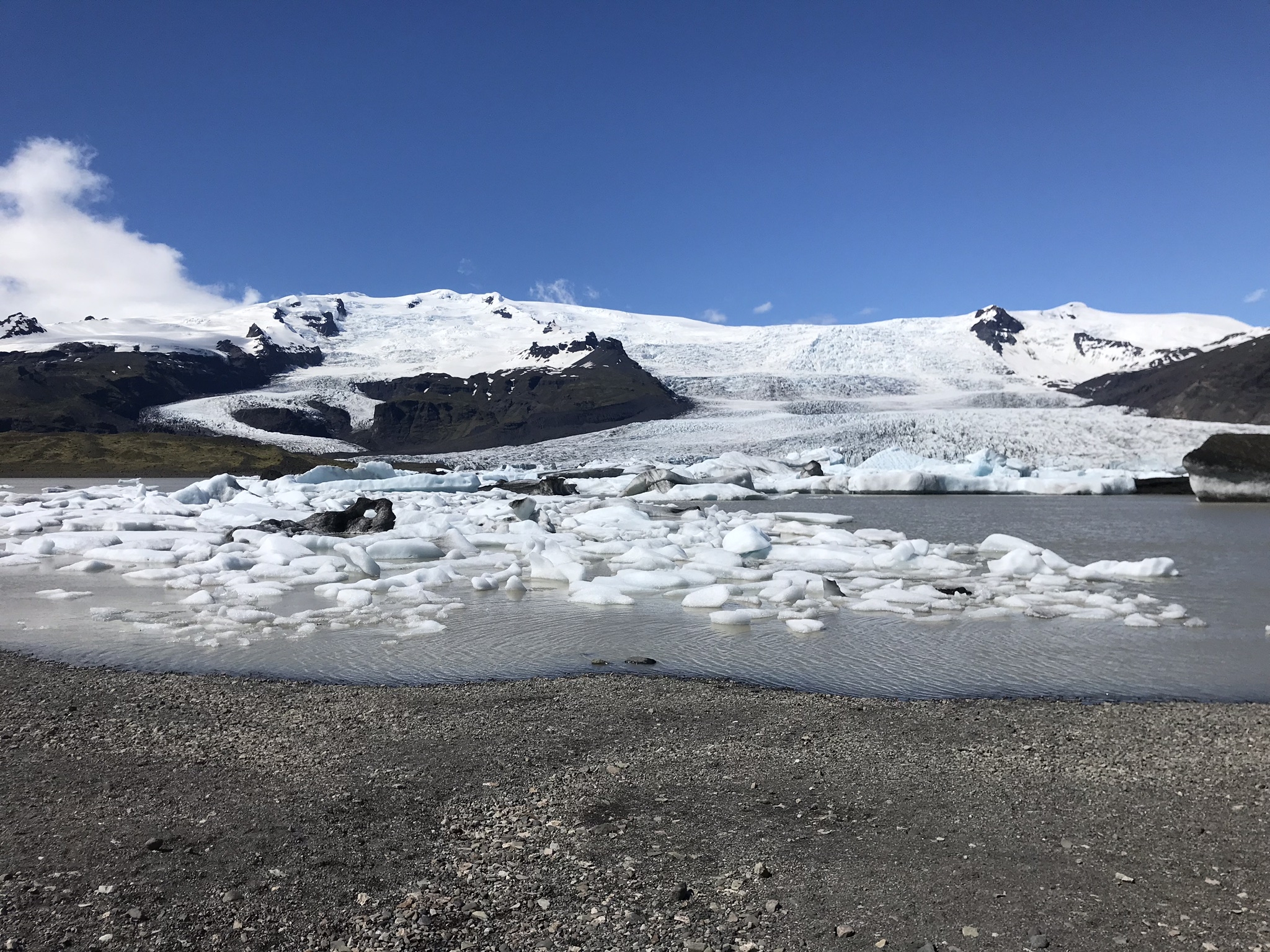 從停車場往下走,眼前所見的是期待已久的巨大冰河湖景色,不過幾分鐘之後,隨之而來的景象卻令人擔心,因為無數個巨大的碎冰伴隨著冰塊崩落水中的連續轟隆聲正快速的飄向出海口。如果五月初的傑古沙龍冰河湖裡面已經沒有什麼大型的碎冰了,那麼到了真正的夏天會如何?早上前往冰川健行的時候已經看到了冰川快速融化的程度;沒想到原來冰河湖的情況也不遑多讓。
