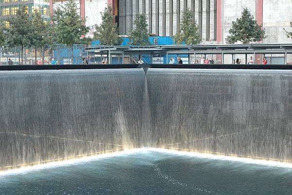 水池的周圍由刻滿受害人名字的銅版圍繞著,水流由銅版下方像是瀑布般沖洩到下方的水池,再度流到中間的方型空洞,流進底下,經過過濾之後,再度回流到上方,繼續這樣的循環。