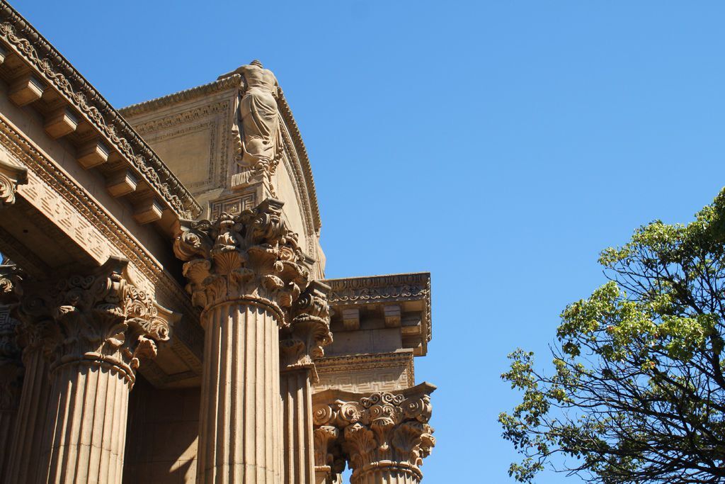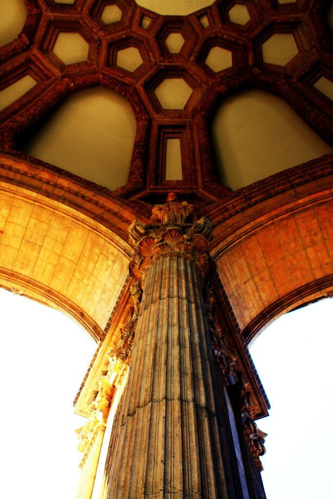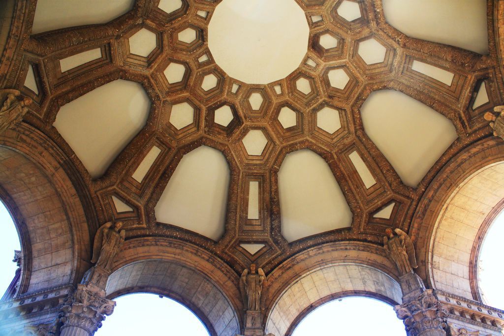 我對藝術宮的印象停留在Sean Conery和他女兒見面的那一幕,就決定我一定要來,好笑的是那個畫面甚至容不下藝術宮高聳柱子的全貌。但是就那一幕,我看到這些玫瑰色的柱子、還有上面的紋路──跟我對倫敦聖保羅大教堂的記憶重疊(當年我從聖堡大教堂的後院發現一個很有希臘味道的入口,原木做的門扉深深緊閉,但牆上有精緻的雕花,一旁的柱子兩個人也環抱不起來),我還記得摸到那些柱子的觸感、和一種好像帶有表情的冰涼,我想知道藝術宮是不是會讓人感受到這種歷史的能量。