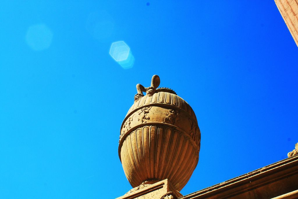 底層是波浪狀的雕花,映著背後的藍天、他好像就是真的白色浪花;每個角落都有一個人形雕像的背影, 好像他們趴在一個水池邊、很努力的在看護著裡面的東西。