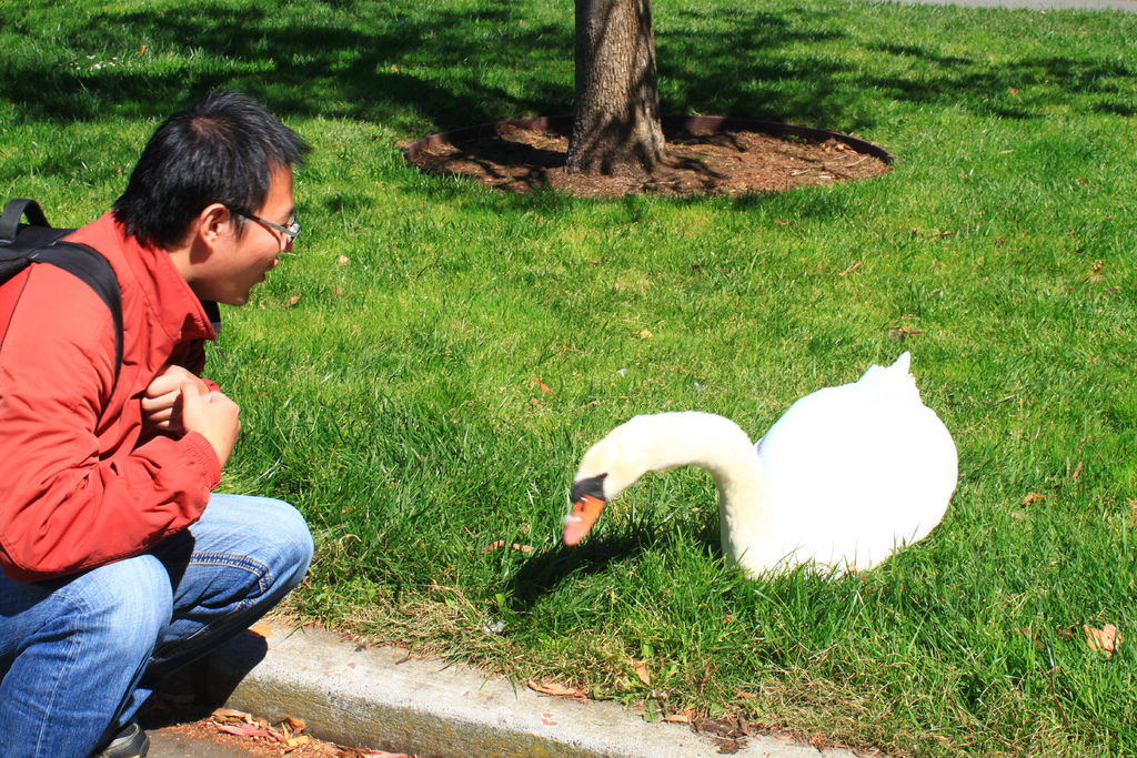 最後要介紹一個有著無辜樣貌的殺人兇器。這隻天鵝靜靜的坐在早地上,我們才想偷偷靠近、就差點被她攻擊到,有看過天鵝攻擊之前、脖子擺動的姿態就像眼鏡蛇要撲過來之前的扭動一樣!,迅雷不及掩耳的速度就甩了過來!!! 害我們瞬間下到、馬上退了好幾步,還好手指也縮的夠快。 所幸他也只是想嚇唬我們,沒有起身追殺。