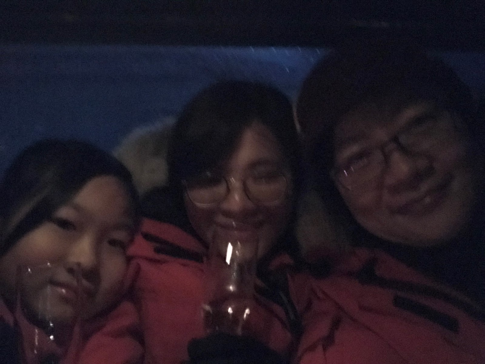 晚餐我們大家一起吃咖哩飯、味噌湯,晚上沒特別事,Ian問我要幹嘛,我說飄雪雲層厚,一定看不到極光,我不出去了,他竟然主動提議用加長禮車載我們出去冰雪路,哇!從很多年前去夏威夷恐龍灣搭過加長禮車後,就沒再搭過了,咨廷媽媽跟咨廷更是大姑娘上花轎頭一遭!還有香檳啊!最後Ian提議去酒吧,可是咨廷不能去,老師們累了想睡,我們就折回民宿!